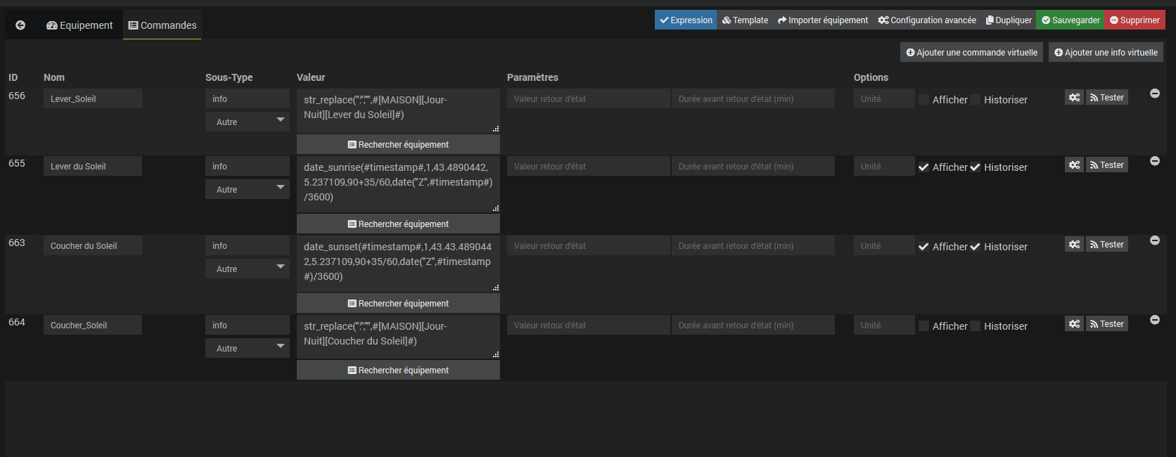@marcoleroi, @Totof54 utilise domogeek qui lui permet de récupérer l’heure de couché soleil sans créer de virtuel… pour moi @Totof54, ton scénario doit fonctionner. Tu peux le tester en modifiant ta valeur + « minutes » (ou mettre en moins) pour que ton scénario s’exécute à l’heure de ton essai.