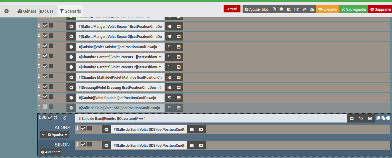 Il faut que tu enlèves ta commande down volet SDB avant ta condition SI, car c’est ta condition qui va faire exécuter ta commande. Car en l’état, tu envoies la commande down et après tu conditionnes si fenêtre = 1 alors tu fermes, mais ça sera déjà fermé par ta commande avant…