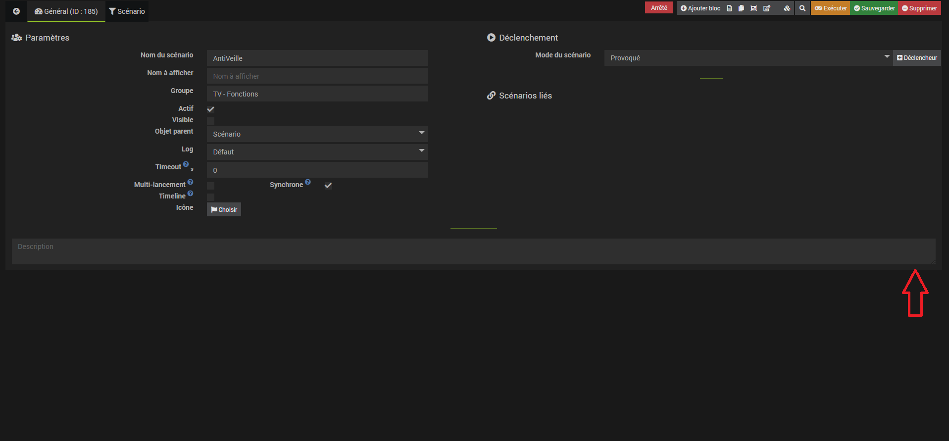 En partant d’un scénario vide, suite à la création d’un premier bloc action, le menu pour ajouter un élément supplémentaire est tronqué