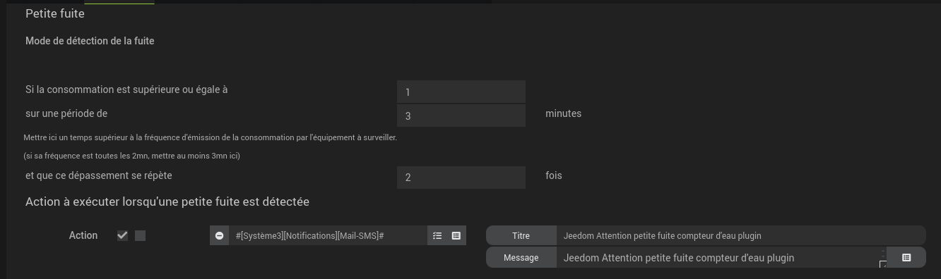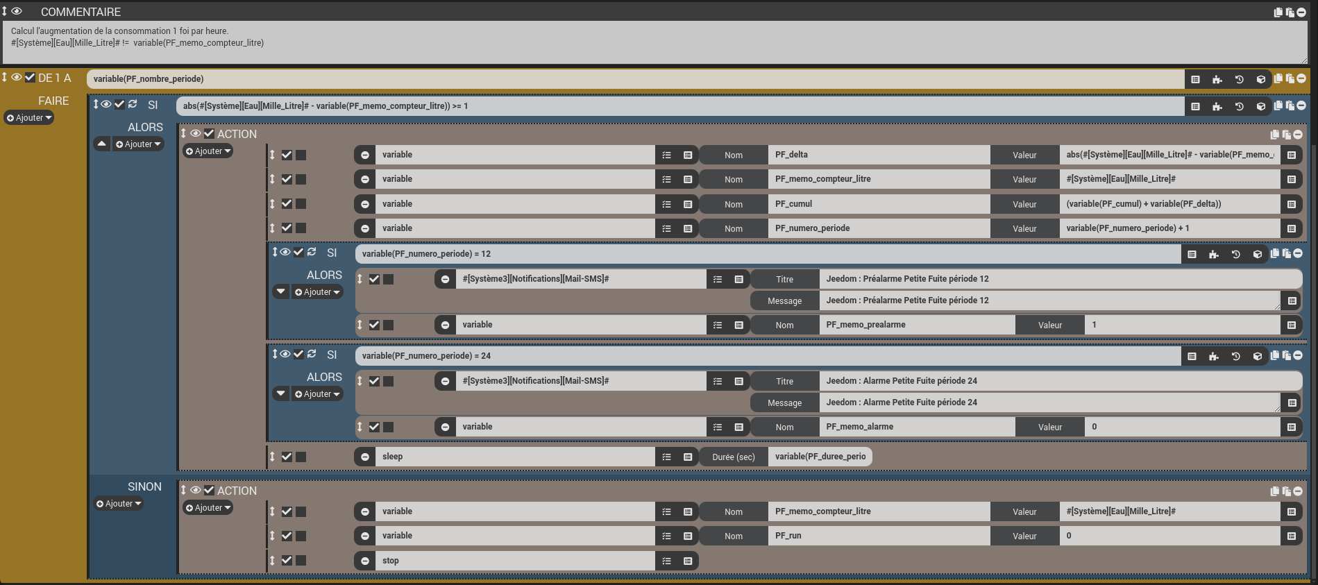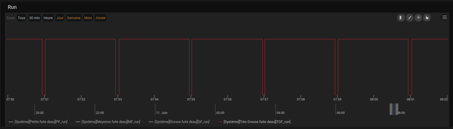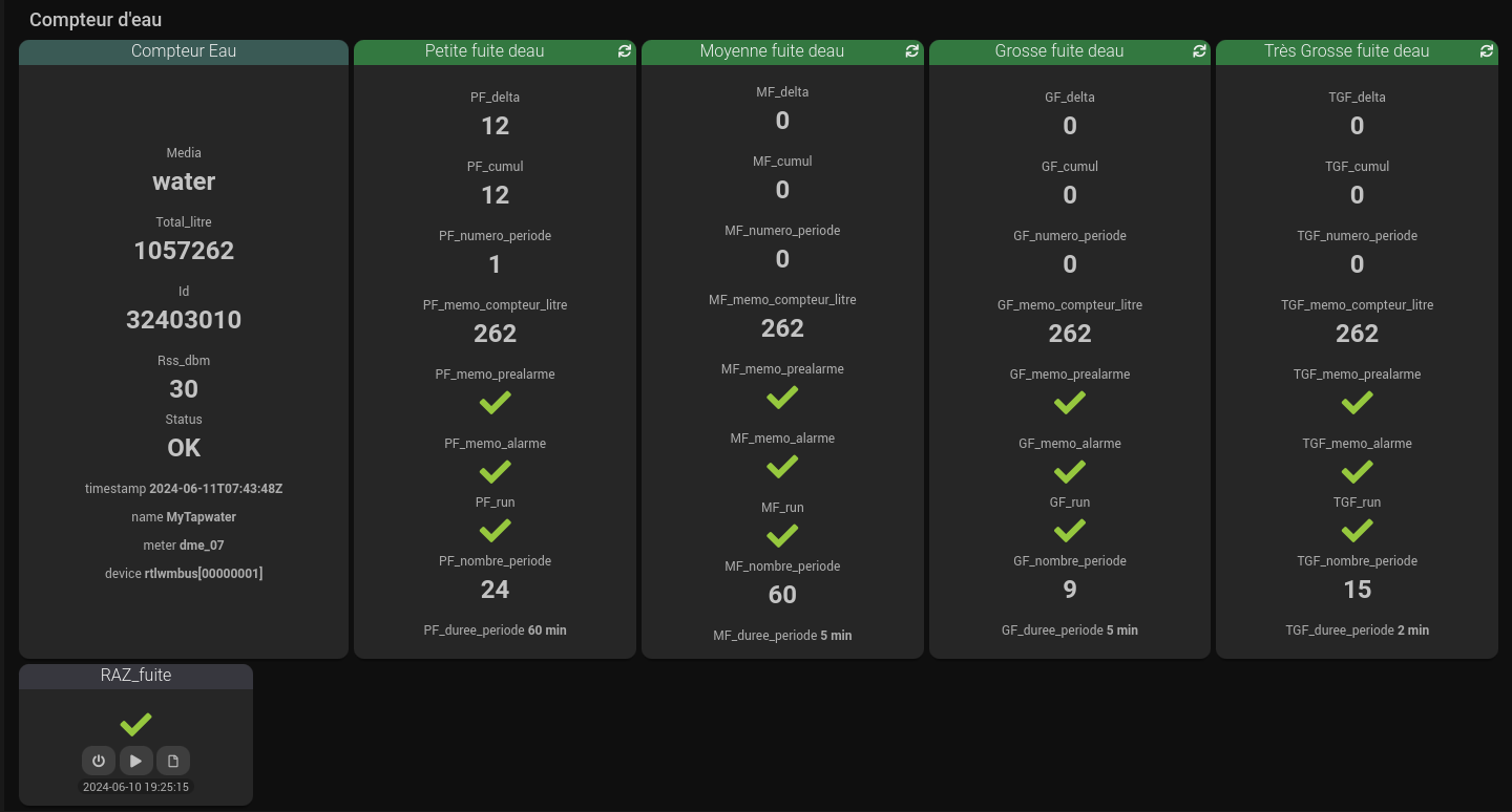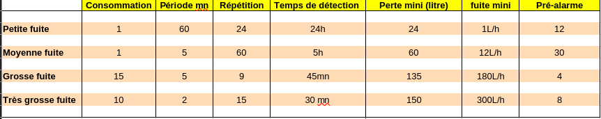 Pour les petites fuites l’alarme est générée après les 24 périodes d’une heure. la pré-alarme est générée à la 12ème période. J’anticipe. Les alarmes sont mémorisées, un scénario reset les alarmes en manuel.