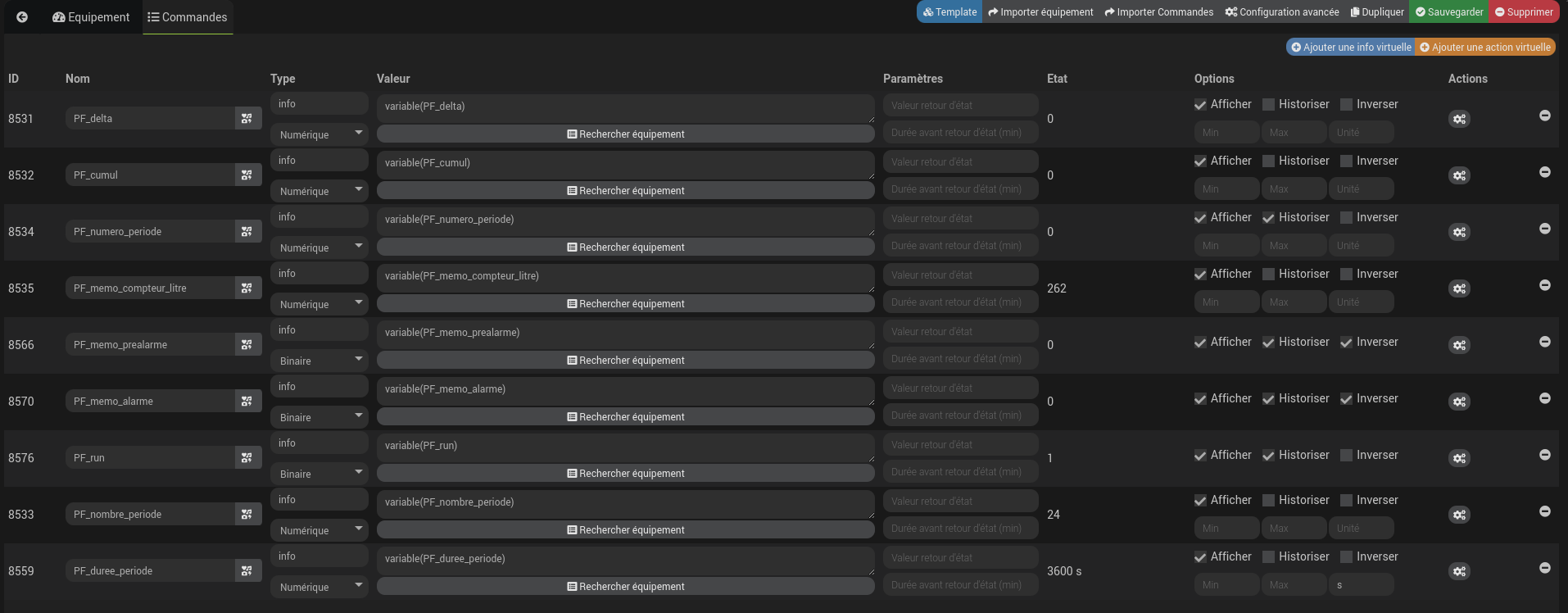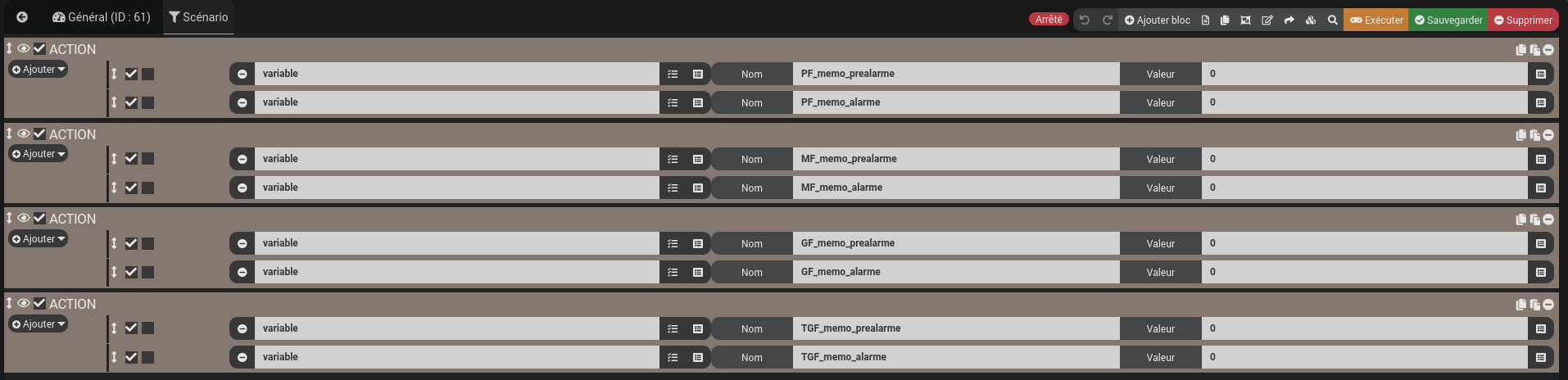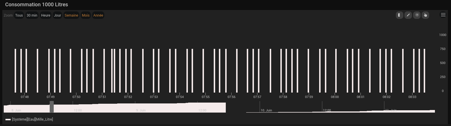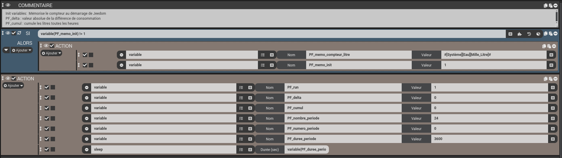 Pour les petites fuites l’alarme est générée après les 24 périodes d’une heure. la pré-alarme est générée à la 12ème période. J’anticipe. Les alarmes sont mémorisées, un scénario reset les alarmes en manuel.