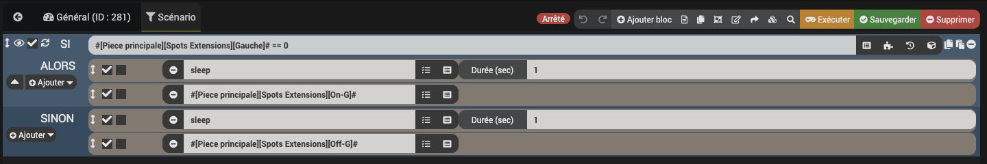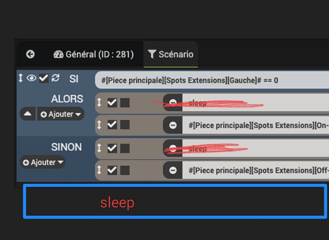 Je ne comprends pas pourquoi Jeedom a besoin de ce sleep pour ne pas repeter 2 fois le scenario, mais l’essentiel est que cela marche