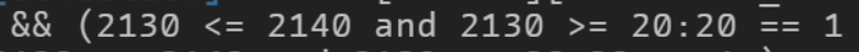 je pense juste que le : perturbe le moteur d’expression et donc le =1 est faux c’est en principe le résultat de la double condition a <=b et c >=d : e , il ne voit pas la fin de l’expression et plante car il évalue de gauche à droite c >=d puis il trouve :e . 2130 > 20 == 1 . le ==1 c’est pour ça 2130 > 20 c’est bien vrai mais la condition après est « syntax error »