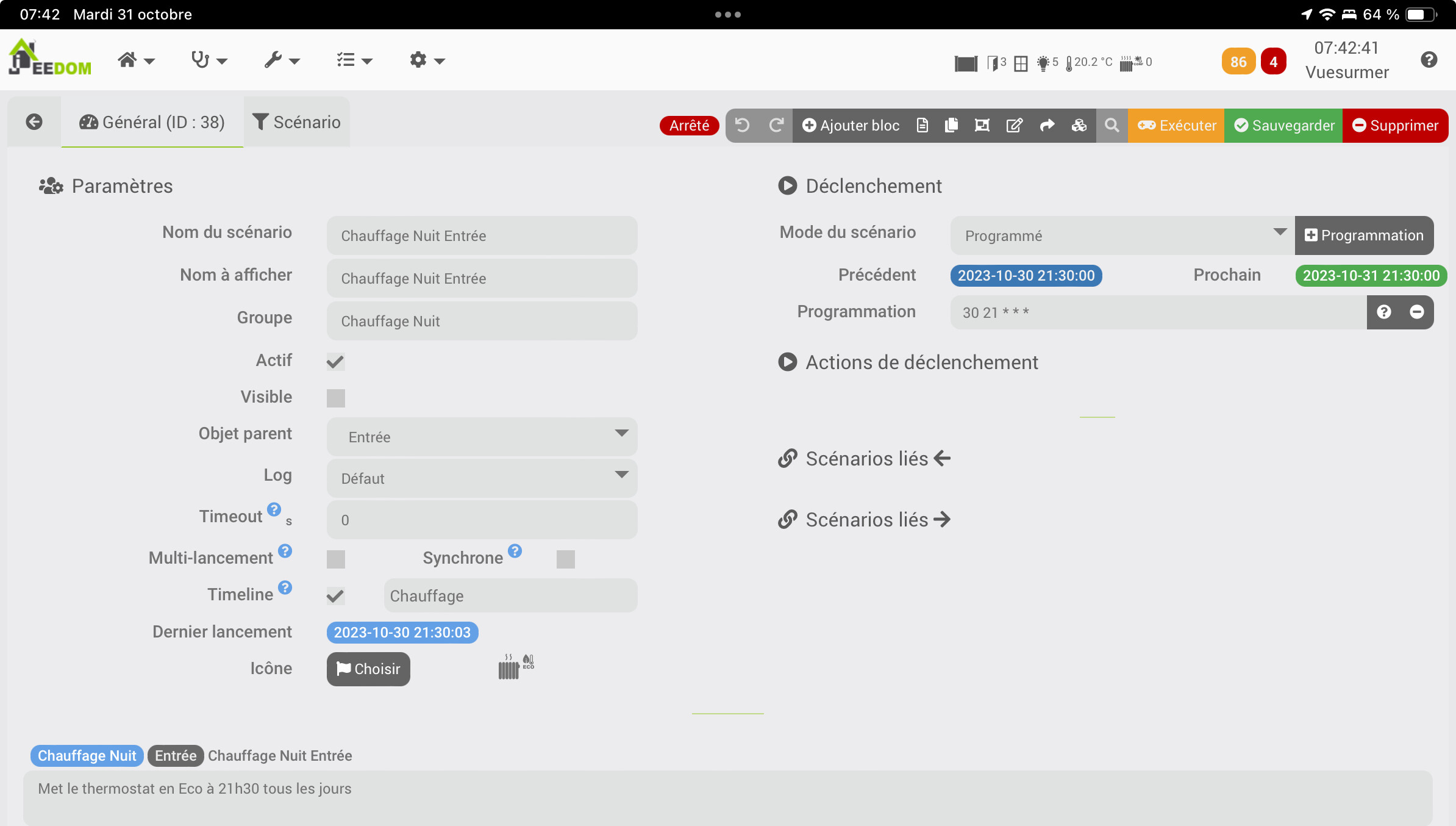 Il est donc normal, qu’un scénario soit a l’arrêt, surtout en mode programmé, en dehors de son instant de déclenchement.