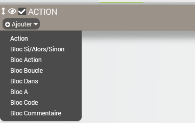 Je crée donc un bloc Action mais malheureusement, cela m’affiche qu’un bloc gris sans possibilité de remplir quoi que ce soit.