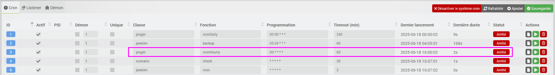 On peut voir sur les logs, qu’hier pas d’exécution ni le 13/06.