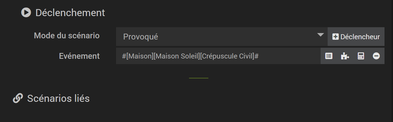 ton scenario a lui meme un declencheur : la commande ‹ coucher soleil › → cas 2