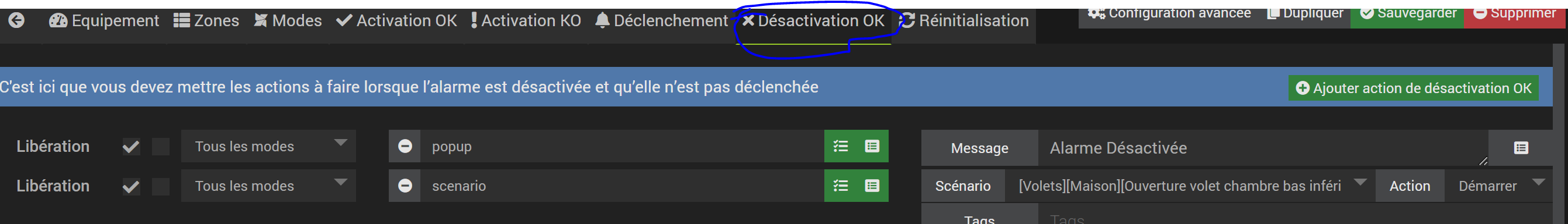 Je lance l’action de ce scénario dans la section désactivation OK du plugin Alarme avec la commande Action « Démarrer » comme ci-dessous :
