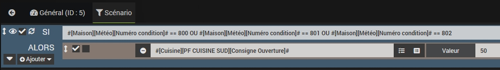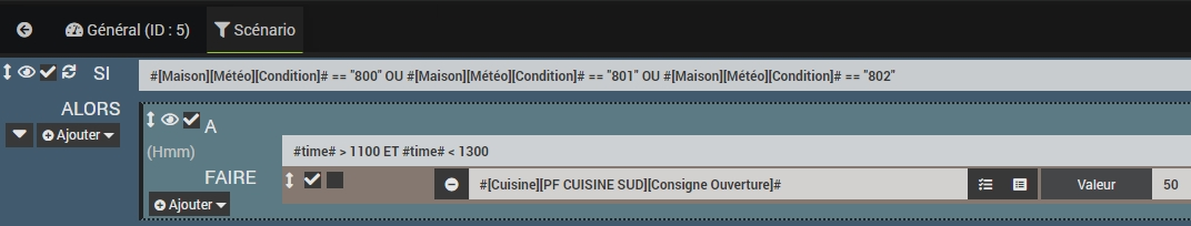 J’ai créé celui-ci pour fermer un volet suivant les conditions météo du plugin Weather et dans un créneau horaire (entre 11 et 13h).