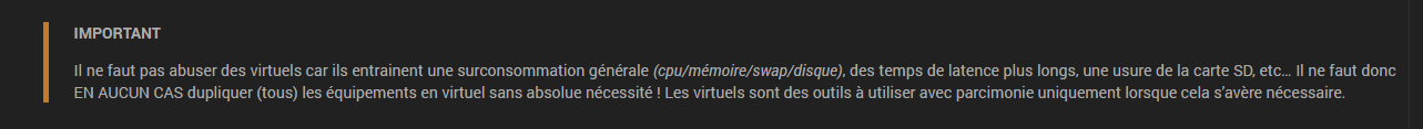 Sur la virtualisation, surtout depuis que l’outil Remplacer existe, c’est pas une super idée. Cet outil permet de facilement changer un appareil dans tout jeedom (scénario compris), il pourrait etre bien de jeter un oeil dessus.