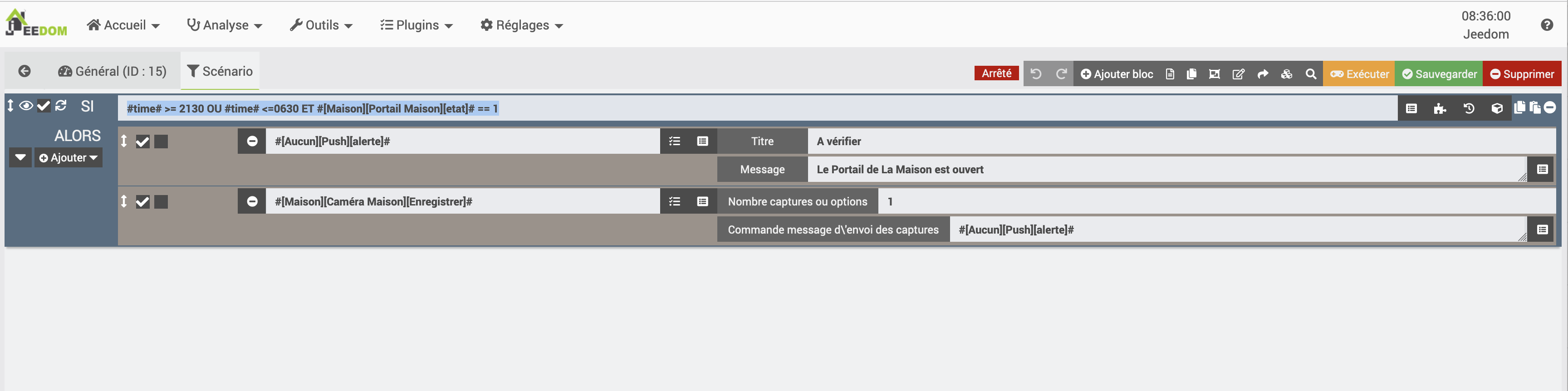 Je vais le peaufiner car ça déclenche l’alerte push de suite, ça n’attends pas 1min de l’état du périf ouvert, ce scénario pour la semaine me va bien, mais en week end si je rentre après 21h30 je veux éviter les alertes push