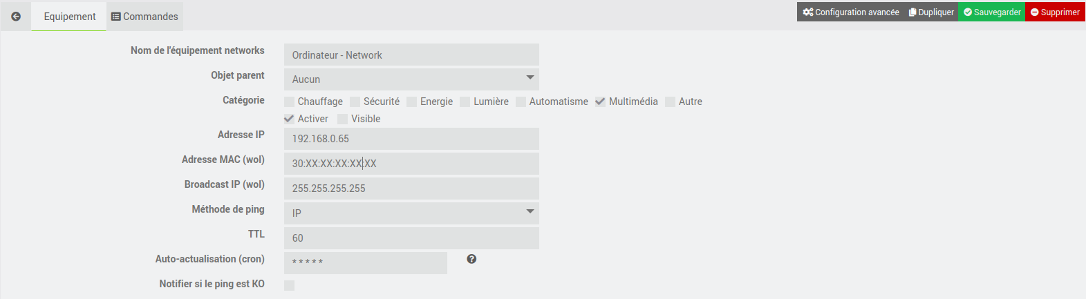 Sachant que comme tu as pu tester via ton terminal, un WOL n’utilise que l’adresse MAC. Elle est broadcast sur le réseau local. L’IP dans le plugin network sert à vérifier si l’ordinateur est encore allumé (état) avec des pings.