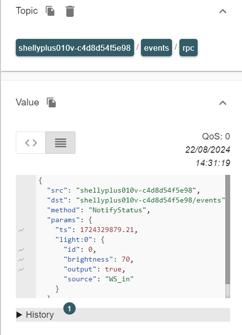 [2024-08-22 14:46:52] DEBUG : Payload '{"src":"shellyplus010v-c4d8d54f5e98","dst":"shellyplus010v-c4d8d54f5e98/events","method":"NotifyStatus","params":{"ts":1724330812.09,"light:0":{"id":0,"brightness":48,"output":false,"source":"WS_in"}}}' reçu sur le Topic 'shellyplus010v-c4d8d54f5e98/events/rpc' traité en 33ms, commandes affiliées , #[GARAGE][Eclairage Devant Garage][events:rpc]#, #[GARAGE][Eclairage Devant Garage][Luminosité]#, #[GARAGE][Eclairage Devant Garage][Etat]#