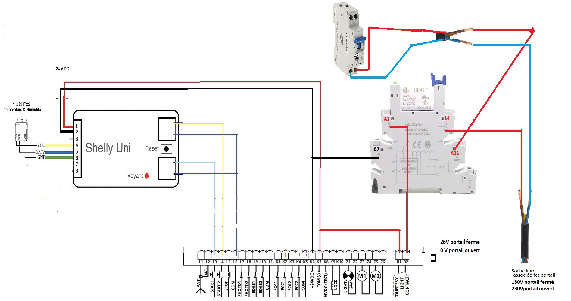 j’ai 26v entre B1 et B2 portail fermé et 0V portail ouvert. Ces sorties sont connectées à un relais qui mène vers un câble libre permettant de brancher un éclairage par exemple en 230V qui fonctionnerait en même temps que le portail. A ce niveau là j’ai 180V portail fermé et 230V portail ouvert.