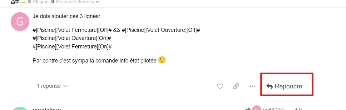 Reste plus ensuite qu’à mettre un widget pour visualiser l’état d’ouverture et de fermeture en fonctiond e la commande info etat (0,49,51,100)