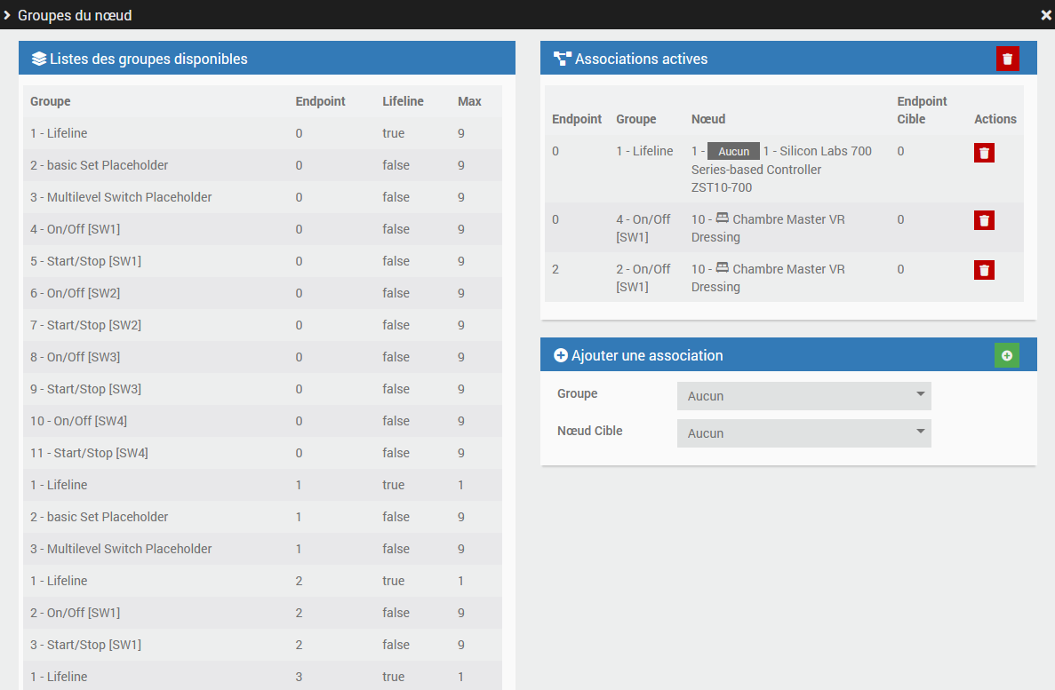 Mais impossible d’ajouter d’autres associations: ni depuis les mêmes endpoint/groupe vers d’autres cibles, ni depuis d’autres endpoint/cibles. Donc impossible d’utiliser les autres entrées du module (SW2,3,4).