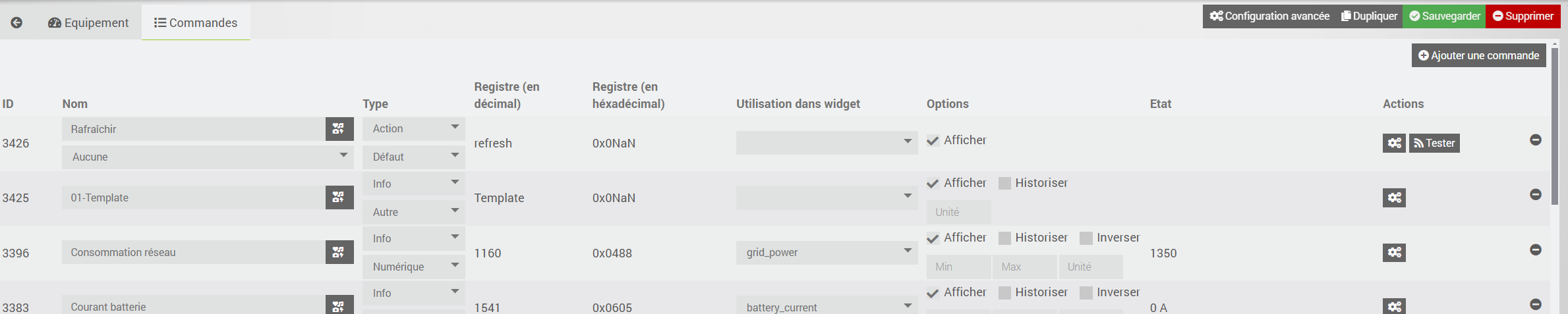 Salut Alain, quel beau prénom . Il faut que tu coches « afficher » de la commande « template » de ton onduleur puis aller dans « affichage » de cette commande pour sélectionner « solarman_distri_onduleur » et enfin renseigner les différents champs comme demandé dans la doc
