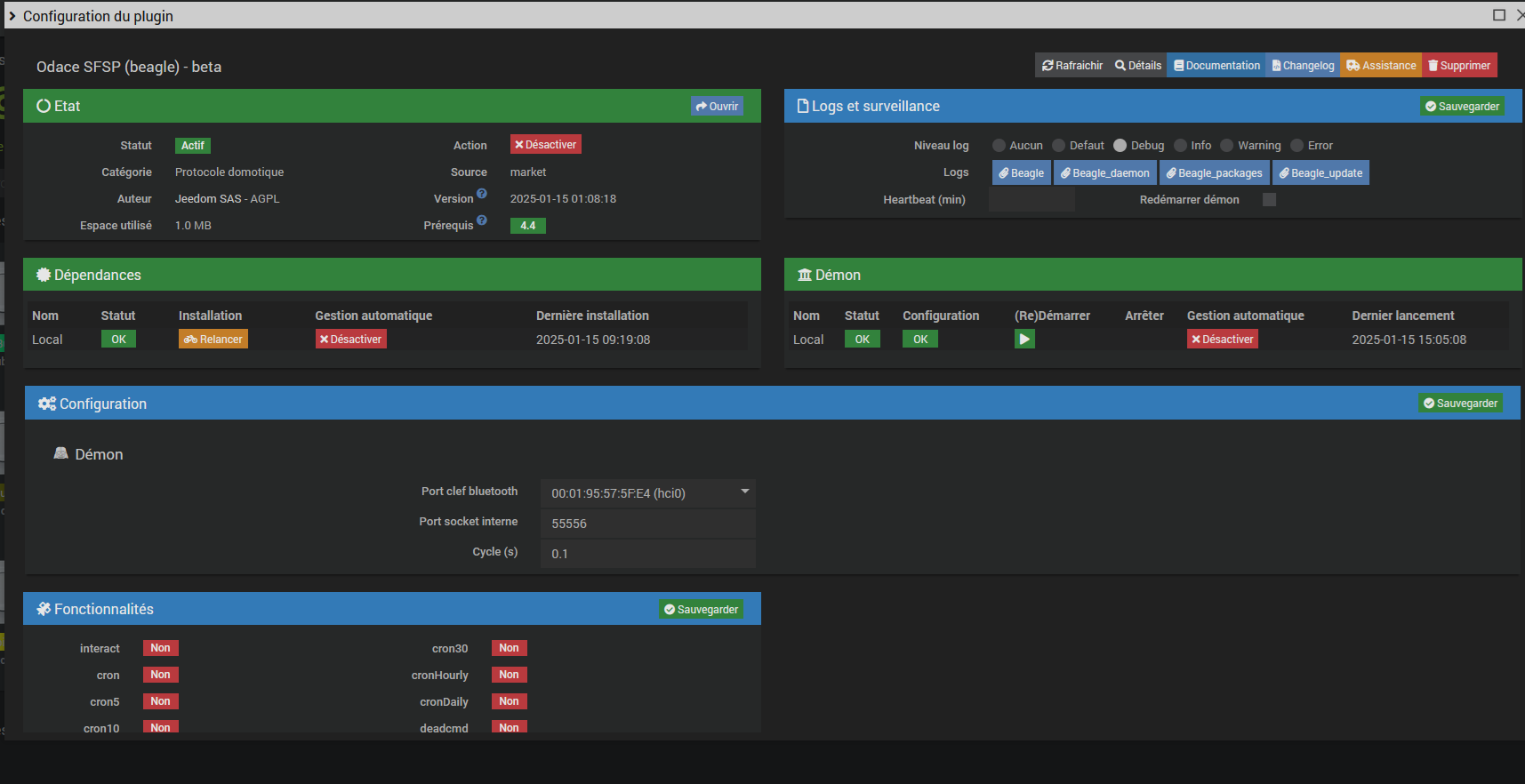 [2025-01-15 15:05:09][DEBUG] : Lancement démon beagle : sudo python3 /var/www/html/plugins/beagle/resources/beagled/beagled.py --device hci0 --loglevel debug --socketport 55556 --sockethost 127.0.0.1 --callback http://127.0.0.1:80/plugins/beagle/core/php/jeeBeagle.php --apikey 6Bxxx --cycle 0.1 --jeedomkey 9xxxx