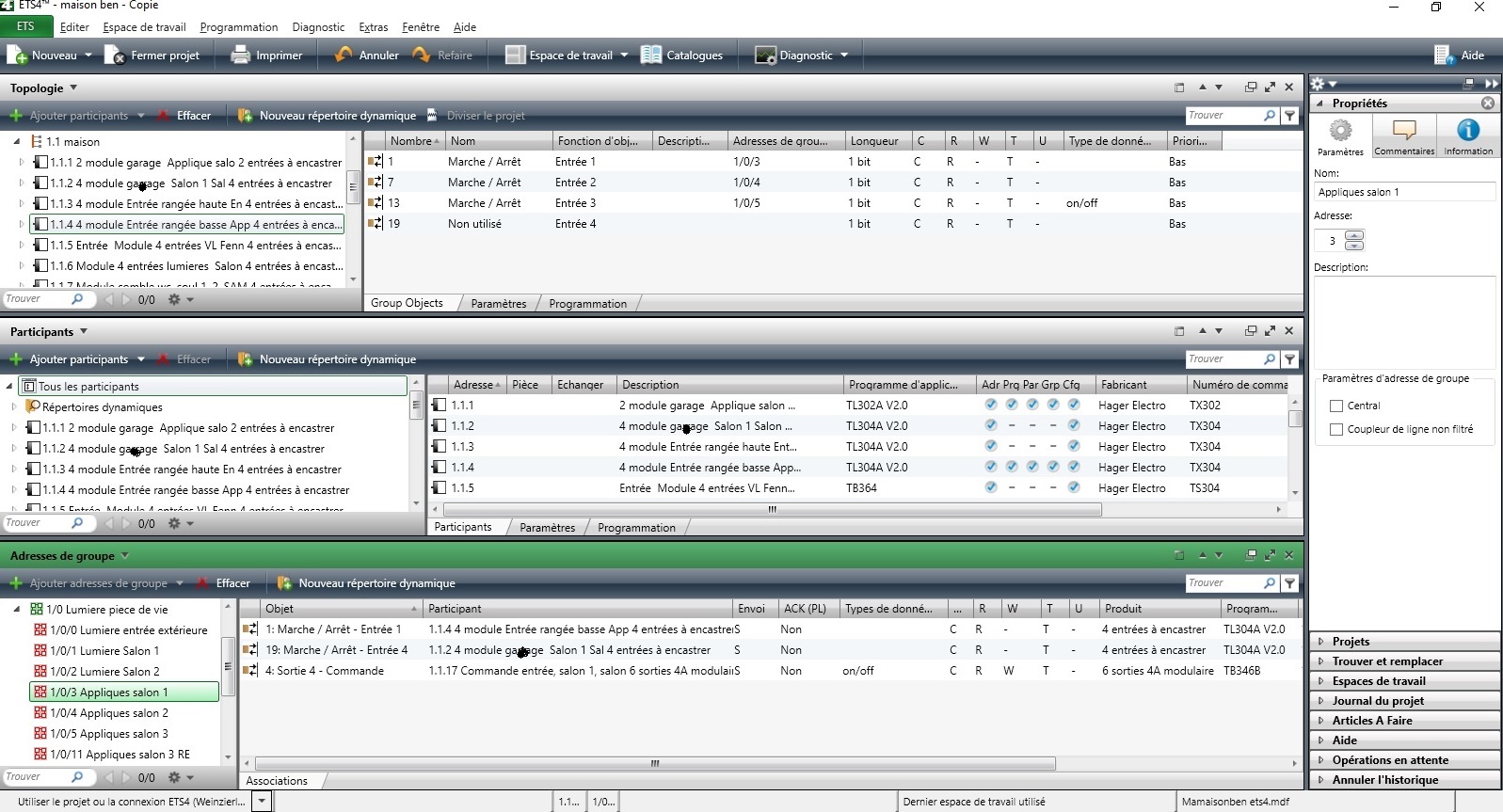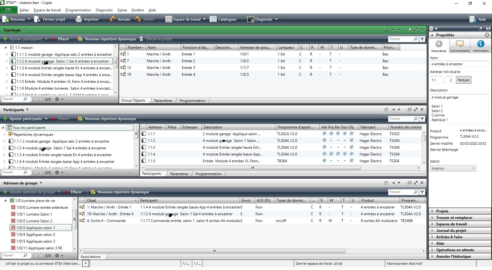 L’installation se compose de module d’entrée Hager TX302 ou TX304 raccordés à des interrupteurs on/off Legrand gamme Sagane.