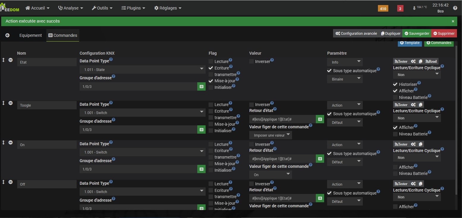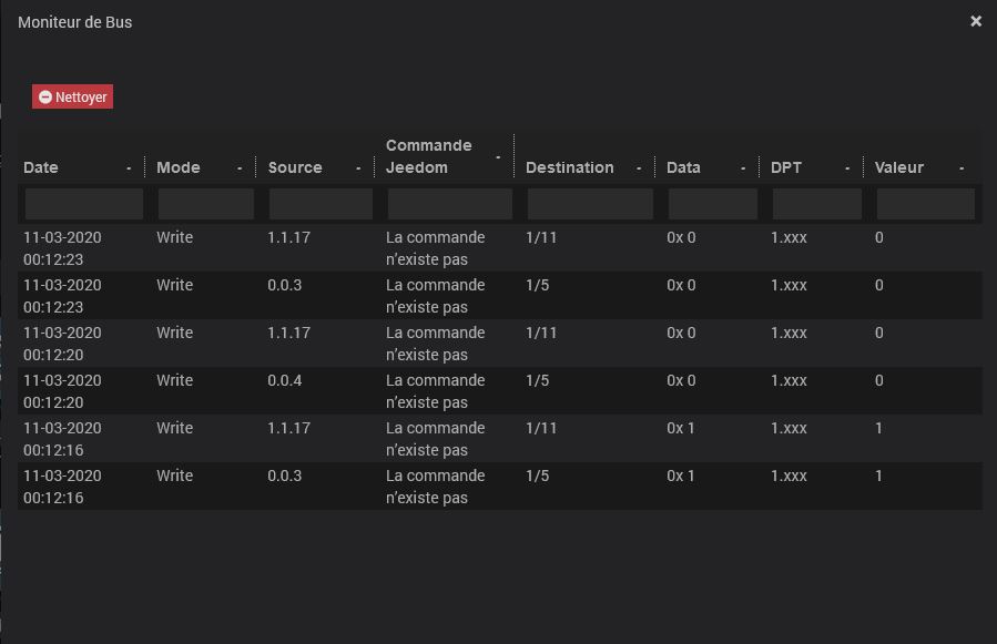 La typologie habituelle des adresses des actionneurs est une adresse pour changer l’état de celui-ci (1/0/3), et une autre pour le retour d’état (probablement 1/0/11 dans ce cas). Qu’est ce qui est observé par le moniteur de bus Jeedom ?