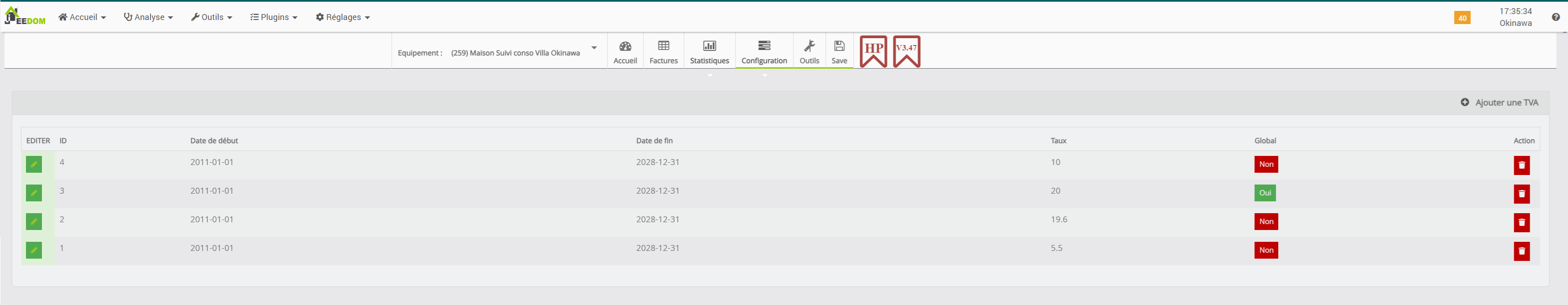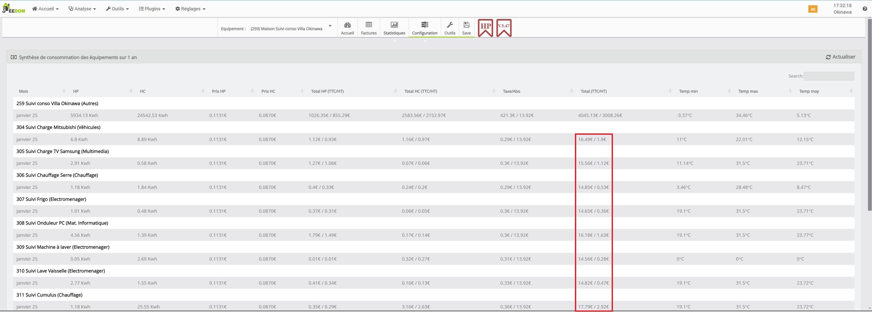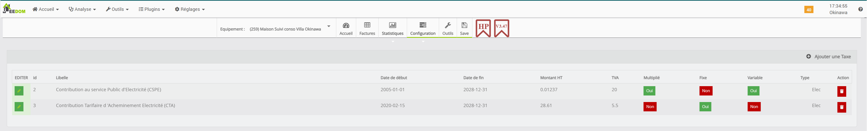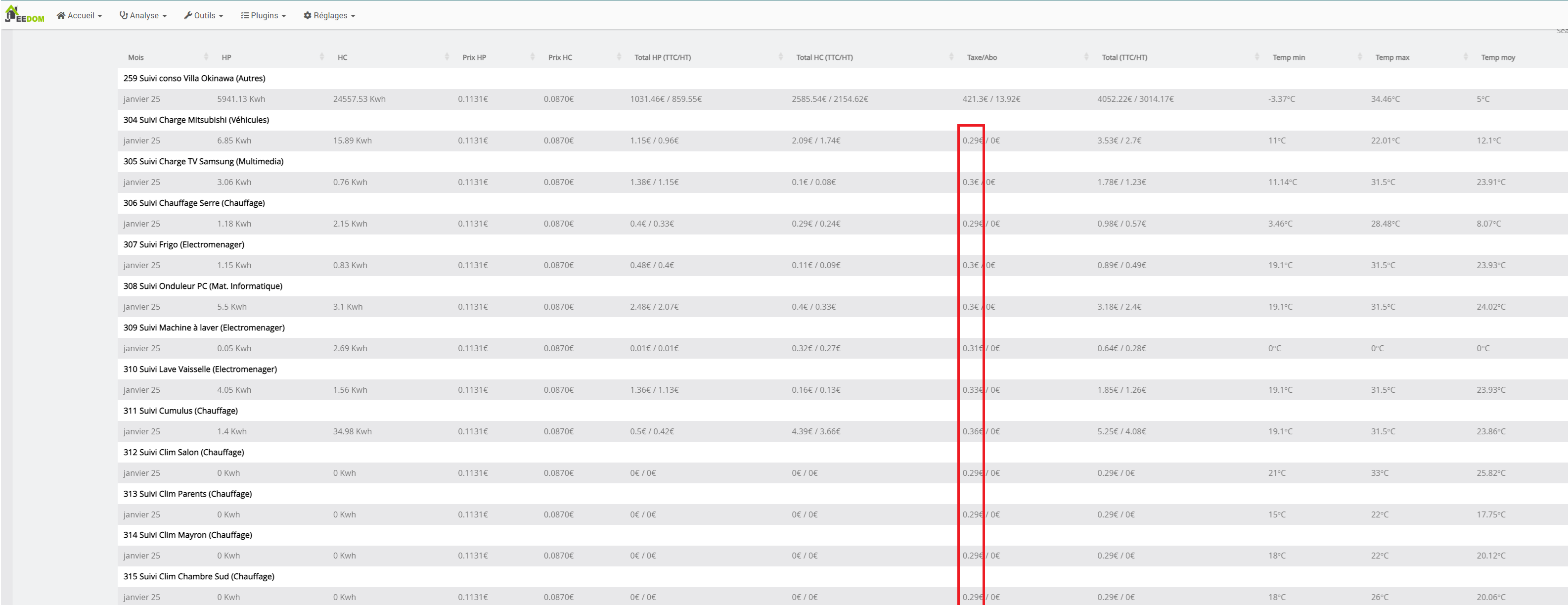 Ce qui est étrange c’est que certains de mes équipement n’ont rien consommés mais affichent tout de même 0.29€ de taxes (voir capture plus haut, les divers « suivi clim xxx » à 0kWh de conso) .