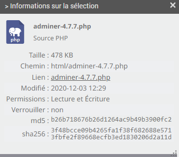 Ensuite, dans le gestionnaire de fichier tu cliques droit sur adminer et tu cliques sur « informations » dans la popup qui apparait. Là tu as un lien (voir ci dessous) et tu cliques dessus