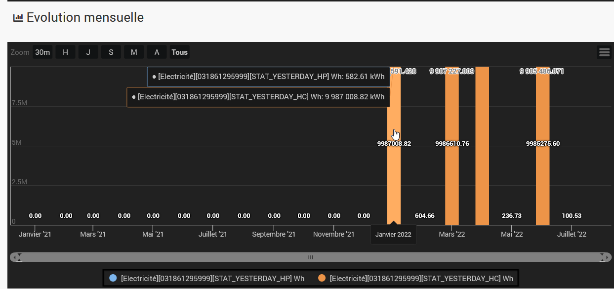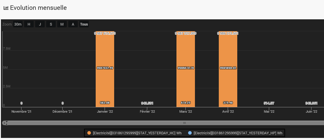 A priori ton souci est situé en HC donc cherche quel index te met le bazar en ne garde dans les index que ceux qui te sont vraiment utiles (vires EJP par exemple). Tu peux t’aider en regardant la doc enedis sur les différents index. Une fois le ménage fait il faut que tu retourne dans ton compteur, tu cliques sur « maintenance » et tu cliques enfin sur « régénérer les stats mensuelles »