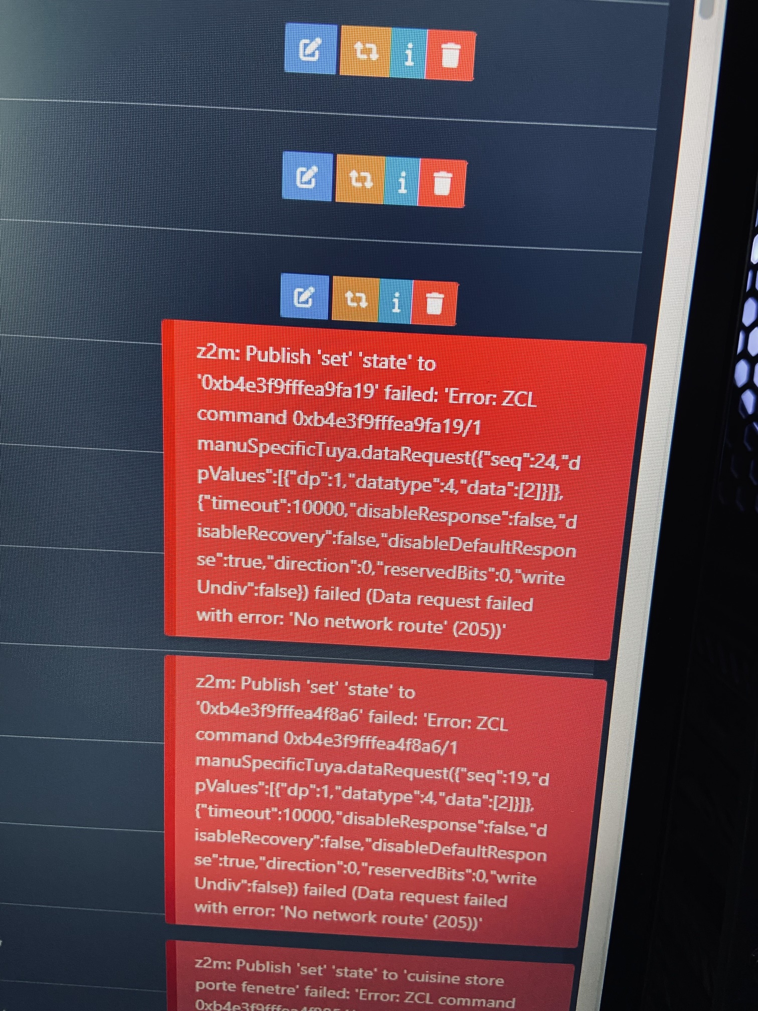 [2024-10-13 15:34:07] e[31merrore[39m: z2m: Publish 'set' 'state' to 'cuisine store porte fenetre' failed: 'Error: ZCL command 0xb4e3f9fffea4f885/1 manuSpecificTuya.dataRequest({"seq":18,"dpValues":[{"dp":1,"datatype":4,"data":[0]}]}, {"timeout":10000,"disableResponse":false,"disableRecovery":false,"disableDefaultResponse":true,"direction":0,"reservedBits":0,"writeUndiv":false}) failed (Data request failed with error: 'No network route' (205))'