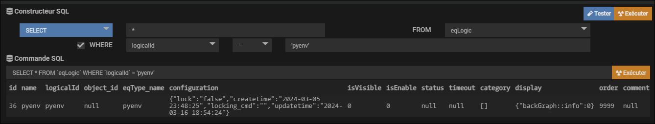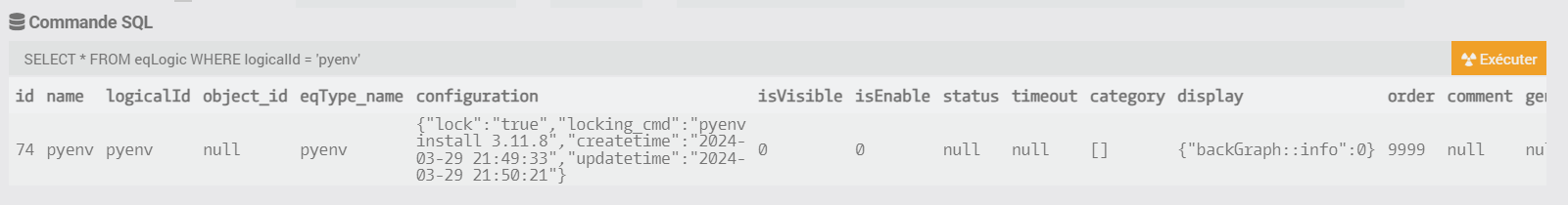Là, taper SELECT * FROM eqLogicWHERElogicalId = 'pyenv' dans la Commande SQL et vérifier si une seule ligne apparait bien :