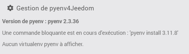 J’ai toujours le même état coté pyenv4Jeedom (j’ai pas compris si c’était normal à ce stade) :