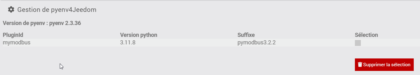 Ca fait depuis la version 17/09/2024 bêta42 que MyModbus n’utilise plus le plugin pyenv4Jeedom. Le plugin pyenv4Jeedom peut être désinstallé, il ne sert plus à rien.