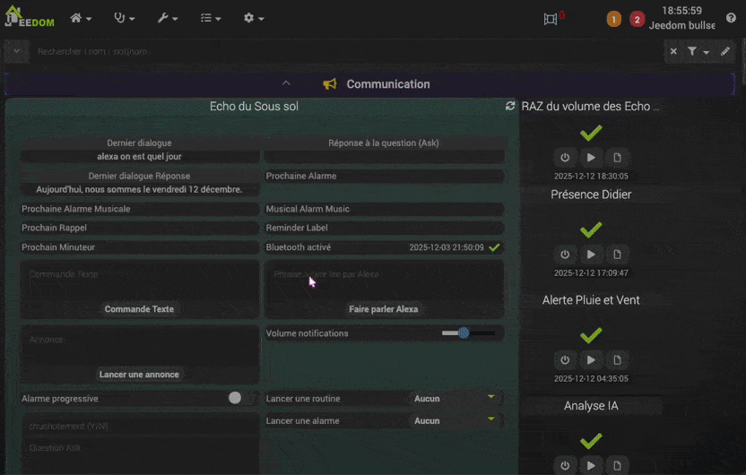 {"createtime":"2025-12-03 21:43:39","device":"Echo du Sous sol","index":2,"intType":"Device","serialNumber":"G091JJ1421630DE0","capabilities":["CUSTOM_ALARM_TONE","ALEXA_DEVICE_REBOOT","AUDIO_PLAYER","SET_TIME_ZONE","EQUALIZER_CONTROLLER_BASS","MUSIC_SKILL","CHANGE_NAME","FLASH_BRIEFING","ALEXA_NETWORKING","DISPLAY_ADAPTIVE_BRIGHTNESS","KINDLE_BOOKS","FAR_FIELD_WAKE_WORD","REMINDERS","UPDATE_WIFI","ALEXA_NETWORKING_WIFI","MULTI_WAKEWORDS_SUPPORTED","TAHOE_BYOD","DEREGISTER_DEVICE","VOICE_TRAINING","DIALOG_INTERFACE_VERSION","TUPLE","TAP_GESTURES","AUDIBLE","ALEXA_PRESENCE","REQUIRES_OOBE_FOR_SETUP","SET_LOCALE","PERSISTENT_CONNECTION","MOTION_DETECTION","SIRIUSXM","APPLE_MUSIC","FACE_TO_TALK","ACTIVE_AFTER_FRO","DREAM_TRAINING","SLEEP","DISPLAY_POWER_TOGGLE","GADGETS","EQUALIZER_CONTROLLER_MIDRANGE","SOUND_SETTINGS","DS_VOLUME_SETTING","EQUALIZER_CONTROLLER_TREBLE","TAP_GESTURES_SINGLE_TAP","ADAPTIVE_LISTENING","ALEXA_NETWORKING_SPEEDTEST","SUPPORTS_LOCALE_SWITCH","SPEECH_RECOGNIZER_USS","TIDAL","TIMERS_ALARMS_NOTIFICATIONS_VOLUME","WAKE_WORD_SENSITIVITY","LOCALIZATION","POPTART","TIMERS_AND_ALARMS","CLOCK_FORMAT_24_HR","BT_PAIRING_FLOW_V2","TUNE_IN","ASCENDING_ALARM_VOLUME","GUARD_EARCON","SUPPORTS_LOCALE","SUPPORTS_CONNECTED_HOME_CLOUD_ONLY","LEMUR_ALPHA","ALEXA_VOICE","GOLDFISH","EFDCARDS","PAIR_BT_SINK","SUPPORTS_SOFTWARE_VERSION","I_HEART_RADIO","PAIR_BT_SOURCE","SUPPORT_CALENDAR_ALERT","VOLUME_SETTING","EARCONS","ADAPTIVE_VOLUME","PANDORA","SALMON","AMAZON_MUSIC","MICROPHONE","AUDIO_CONTROLS","TUPLE_CATEGORY_A","DISPLAY_BRIGHTNESS_ADJUST","DEEZER"],"type":"XXXXXXX","family":"ECHO","accountId":"XXXXXXXXXX","OwnerCustomerId":"XXXXXXXXX","isControllable":1,"hasMusicPlayer":1,"isMultiroomDevice":0,"isMultiroomMember":1,"icon":"A2H4LV5GIZ1JFT.png","intFriendlyType":"Echo 4 Clock","cmdsCheked":true,"updatetime":"2025-12-17 20:56:53","deviceTypeID":"XXXXXXXXXX","deviceClassification":"DEVICE","deviceFamily":"ALEXA","registeredDate":"10 novembre 2023","address1":"xxxxxxxxxxxxxx","postalCode":"NYW800","state":"USA","city":"NYW","distanceUnits":"METRIC","providerPreference":"BELL","responseStyle":"CONCISE","temperatureScale":"CELSIUS","timeZoneId":"Europe\/Paris","communications":1,"announcements":1,"messaging":1,"":0,"C":1,"interactionjeedom":"0","cronverrouille":"0","widgetPlayListEnable":"0","appDeviceList":[],"clusterMembers":[],"country":"","autorefresh":"","dernierLancement":""}