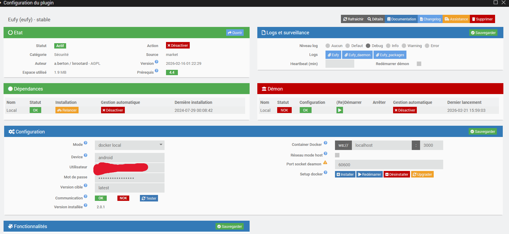 [2026-02-21 15:58:15] INFO Info sur le démon : {"log":"eufy","state":"nok","launchable":"ok","launchable_message":"Gestion automatique d\u00e9sactiv\u00e9e","auto":"0","last_launch":"2026-02-21 02:00:21"}