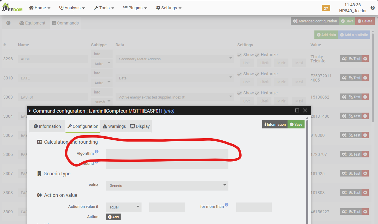 Cela pourrait s’arrêter là si dans la commande de l’équipement intermédiaire « MQTT Manager » on pouvait intégrer une formule de calcul, par exemple pour convertir les kWh en Wh (EASTx1000, EASF01x1000, etc.) mais cela ne semble pas pris en compte ou alors je n’ai pas trouvé comment.