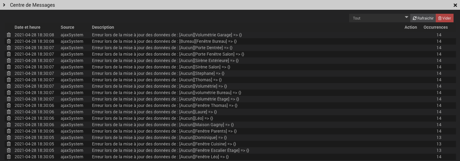 Je pense plutôt que cela viens du Hub AJAX mon modele HUB2+ car tous les équipements sont identique ils se sont créé seulement avec rafraichir même les télécommandes. j’ai désinstallé et réinstallé même chose pareil sur un autre jeedom (RPI4), la je tourne avec un odroic C2 pour ma prod.