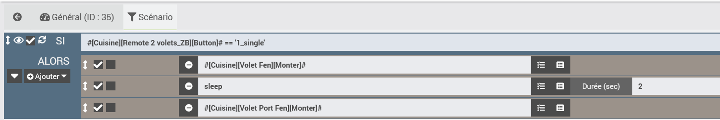 J utilise une telecommande ‘loratap 3 boutons’ qui répond parfaitement si appui sur les 3 touches et commande bien mes 2 volets à partir du scénario ci-dessous.