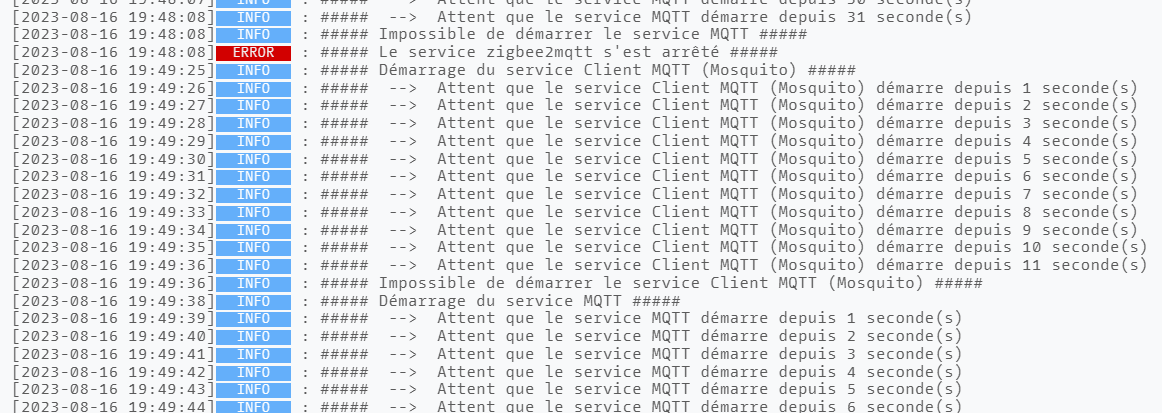 j’ai mon service zigbee2mqtt et Mqtt qui s’est arrêté et impossible de relancer quoi que ce soit. J’ai essayer de relancer l’installation des dépendances mais rien à faire.