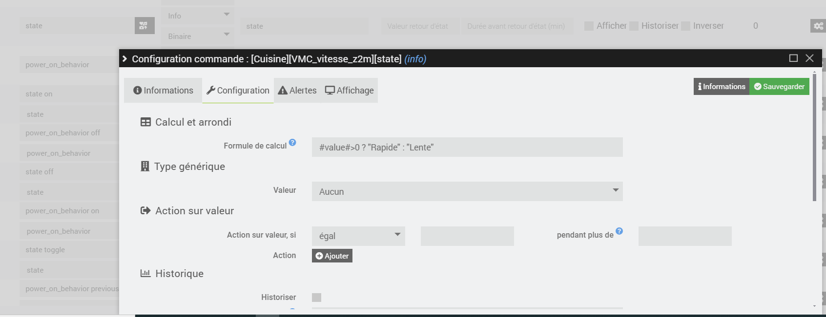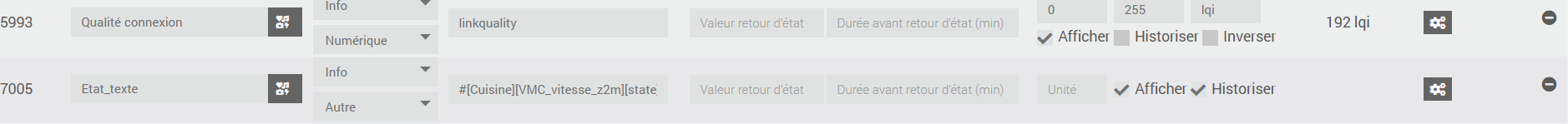 NB: il est préférable quand même de faire un changement d’état avec la commande Action de l’équipement pour voir vraiment la valeur texte s’affichait (ON/OFF), lors du passage de la commande info …de binaire à autre