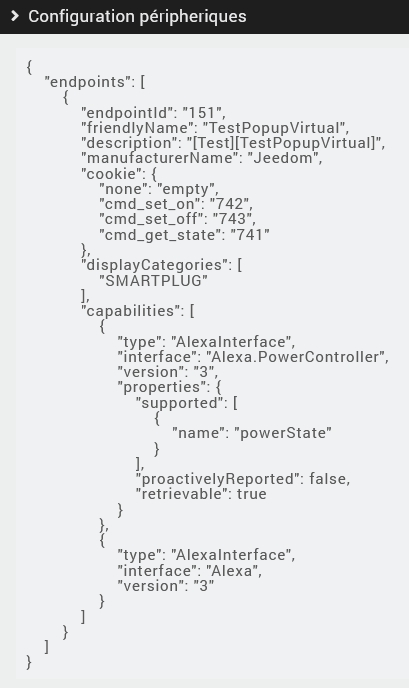 Bonjour, je n’arrive pas à retrouver un équipement sur Alexa. J’essaye de transmettre l’équipement, mais j’ai l’impression que l’info n’arrive pas sur les serveurs d’Amazon. ci-joint l’équipement que j’essaie de transmettre. Merci d’avance de votre aide. C’est le premier équipement que j’essaie de transmettre.