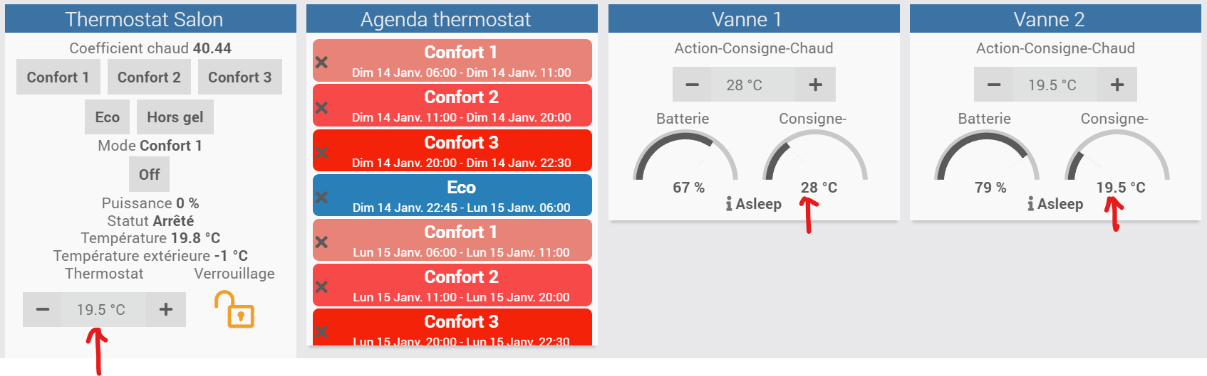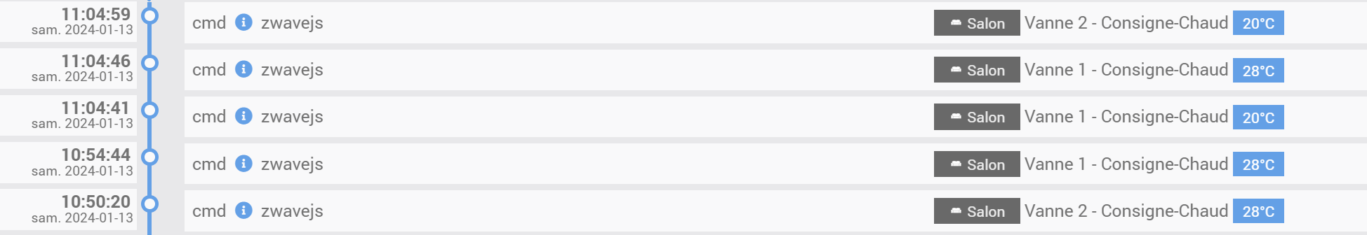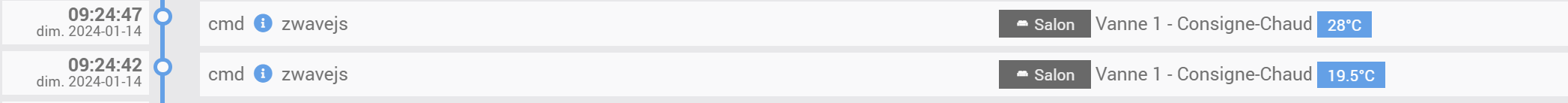 Ici je vois qu’une des 2 vannes du salon passe à 28 puis à 20°(11:04:41) en fin de chauffe mais repasse à 28° dans les secondes qui suivent (11:04:46) et y reste. Comment puis je trouver l’origine de cette commande ?