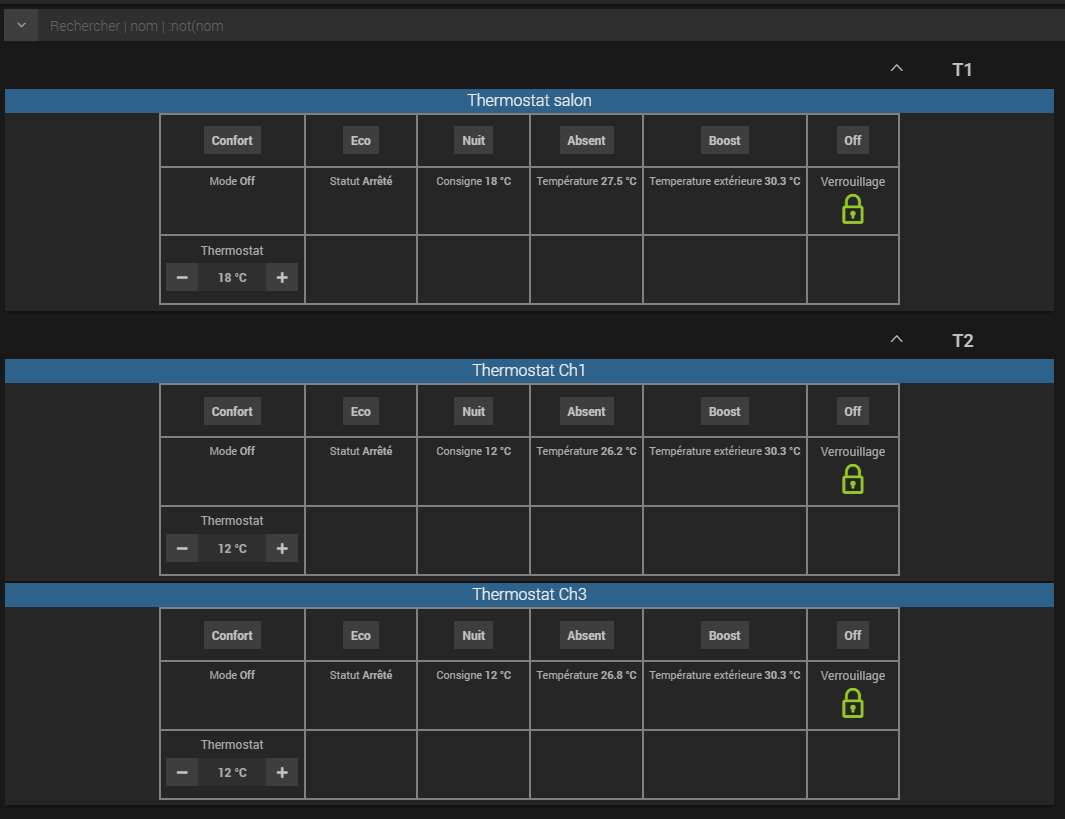 Voila mes constatations Voulant organiser mes tuiles thermostat en utilisant le mode tableau j’ai constaté qu’un seul thermostat peut être mis en tableau pour un objet (étage) Si on cré des pièces dans cet étage seul le premier thermostat créé peut être mis en tableau ceux des autres pièces ne peuvent pas l’être. Il est en outre impossible de placer les contrôles et informations dans un arrangement précis ceux ci sont replacé systématiquement dans l’ordre de leur ID.