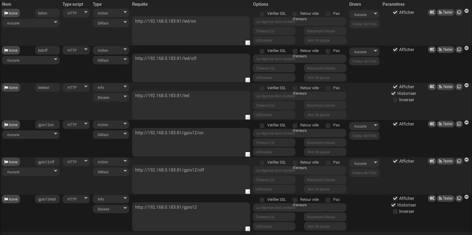 Par script pour les entrées/sorties (led / GPIO12). Voir l’en-tête du code .ino pour les paramètres du script.