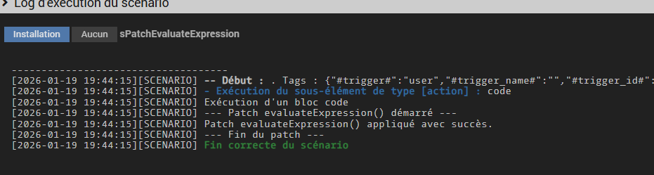 $scenario->setLog('--- Patch evaluateExpression() démarré ---');