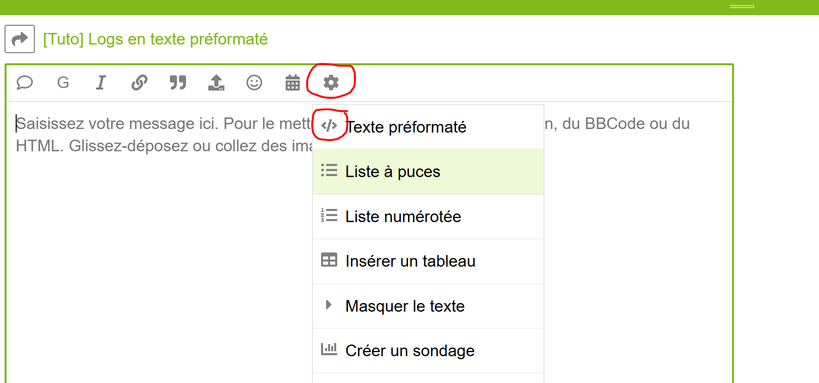 - Rendez vous dans le sujet que vous avez créé puis éditez le (lors de la création ou d’une réponse)