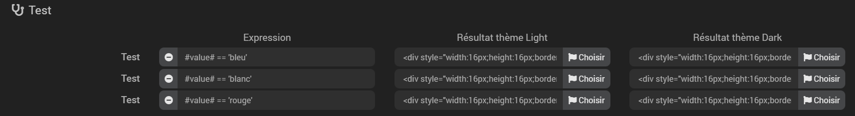 #value# == 'bleu'puis#value# == 'blanc'puis#value# == 'rouge' - Complétez avec en ajoutant un résultat pour chaque expression :