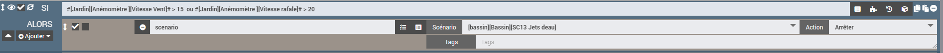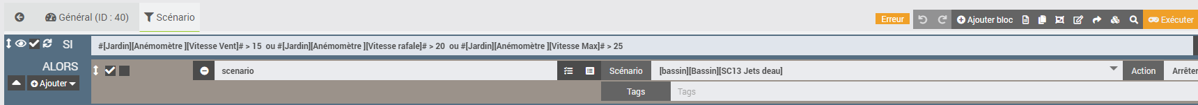 En fait quand je suis absent je supprime un des jets pour cela le scénario teste la variable 16 si V16 = 1 je suis la le jet rotatif fonctionne . Si V16=0 je ne suis en vacances le jet rotatif ne fonctionne pas. c’est complémentaire à la condition s’ill ya du vent le scénario scenario.txt (2,6 Ko)