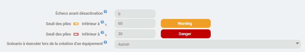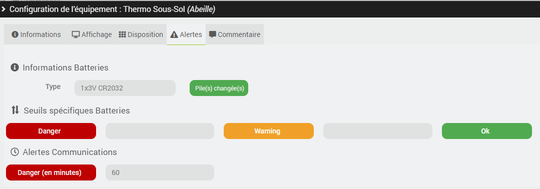 Je pense qu’il y a un point qui bloque dans Jeedom pour cet équipement, pour que l’alarme sur l’équipement disparaisse et que ce logo de batterie disparaisse également.