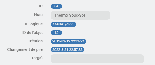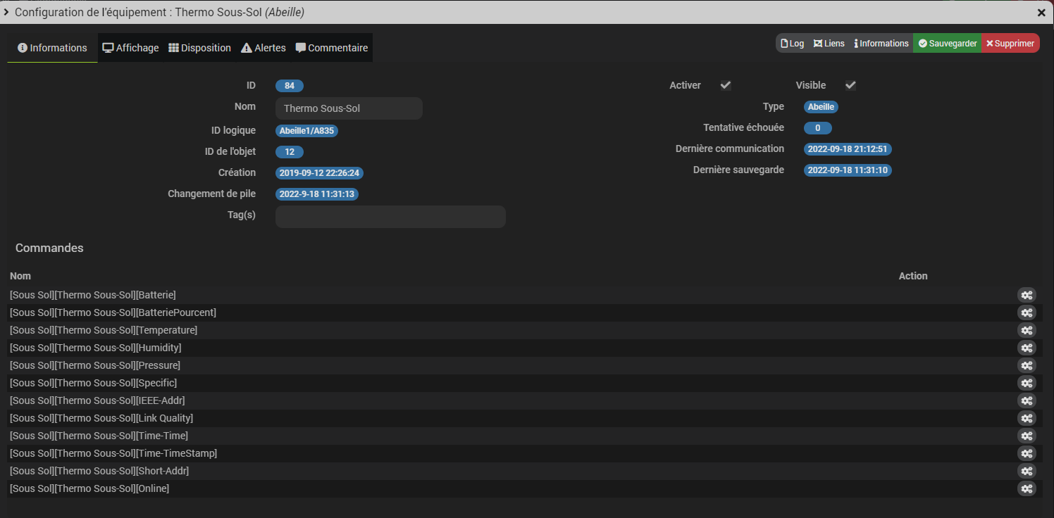 J’ai changé la pille de l’équipement ‹ Thermo Sous-Sol ›, l’équipement remonte bien avec une batterie à 100%, j’ai également indiqué le changement de la batterie dans la configuration avancée.