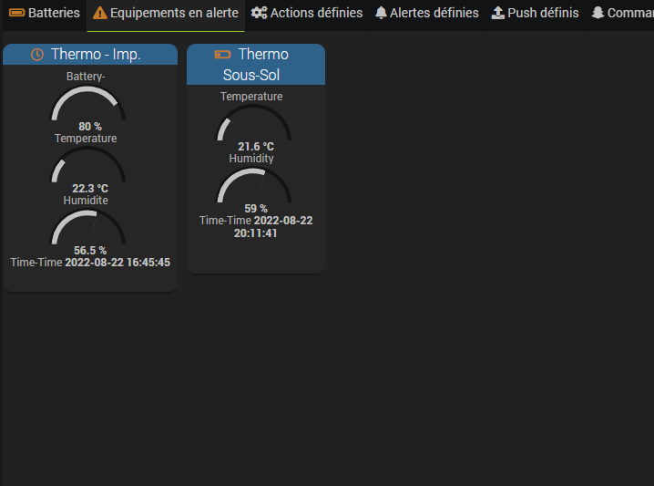 Voici la capture de tous mes équipements et seule l’équipement Thermo Sous-sol est en alerte, ce qui n’est pas normal, il ne devrait pas l’être.