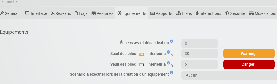 Je n’ai aucune configuration spécifique pour les équipements, je laisse ma configuration standard de Jeedom